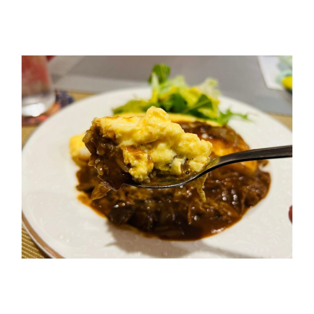 ふわとろの卵に、よく煮込まれたハヤシソースがたっぷり。